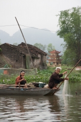 Arrive au port, pas de chance, tout est embrume et il tombe un crachin que certains qualifieraient de “breton”. On embarque sur notre superbe bateau et finalement les formations rocheuses se decouvrent peu a peu et donnent un cote tres mysterieux a la baie… pour nous consoler, on nous dira que c’est comme ca qu’elle est la plus jolie. Apres copieux repas servi a bord, nous partons decouvrir le paysage de plus pres, en kayak. Vraiment tres agreable et paysage impressionnant. De plus, pour plus de clarete, la baie de Bai Tu Long est la petite soeur de la baie d’Halong. Situee quelques km au nord, elle presente les memes paysages mais avec quasiment aucun touriste. Et effectivement, on n’a pas croise un bateau touristique pendant 3 jours (pour ca on s’est quand meme tape 1h30 de bus en plus que les autres…). Le soir on a dormi chez l’habitant (un pecheur a la retraite), sur l’ile de Quan Lan.