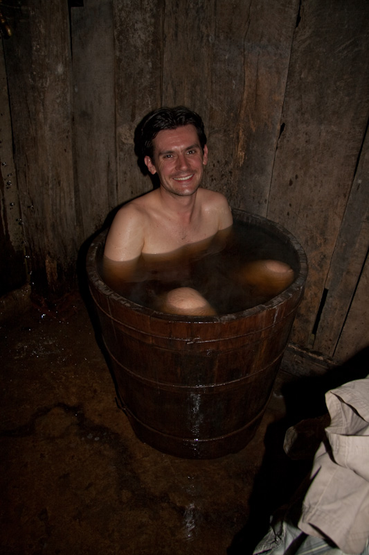 Apres cette grosse journee (20km), nous avons ete recompense a notre arrivee dans notre 2e Homestay, par un excellent bain brulant aux herbes aromatiques dans un gros tonneau en bois… un regal!