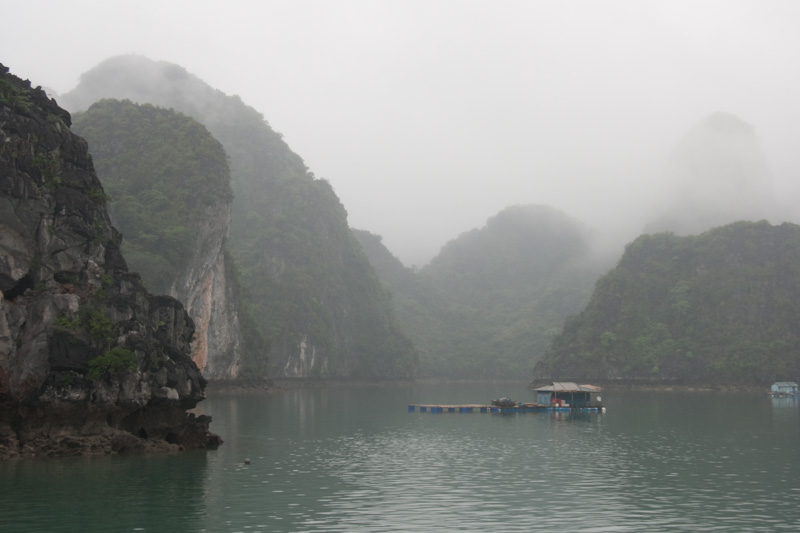 Arrive au port, pas de chance, tout est embrume et il tombe un crachin que certains qualifieraient de “breton”. On embarque sur notre superbe bateau et finalement les formations rocheuses se decouvrent peu a peu et donnent un cote tres mysterieux a la baie… pour nous consoler, on nous dira que c’est comme ca qu’elle est la plus jolie. Apres copieux repas servi a bord, nous partons decouvrir le paysage de plus pres, en kayak. Vraiment tres agreable et paysage impressionnant. De plus, pour plus de clarete, la baie de Bai Tu Long est la petite soeur de la baie d’Halong. Situee quelques km au nord, elle presente les memes paysages mais avec quasiment aucun touriste. Et effectivement, on n’a pas croise un bateau touristique pendant 3 jours (pour ca on s’est quand meme tape 1h30 de bus en plus que les autres…). Le soir on a dormi chez l’habitant (un pecheur a la retraite), sur l’ile de Quan Lan.