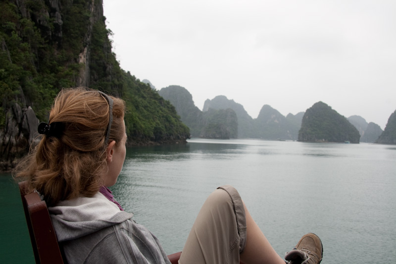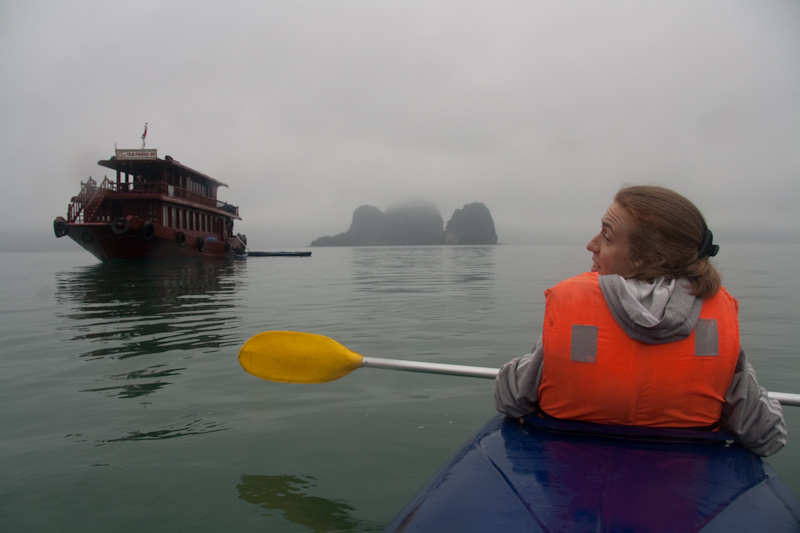 Aujourd’hui= premiere journee a l’envers et sans la brume, bateau, kayak, bateau et bus. Maintenant, on va manger un morceau puis attendre le train qui doit partir a 21h50. Au programme des 3 jours qui viennent: rando dans les rizieres de montagne a Sapa 🙂