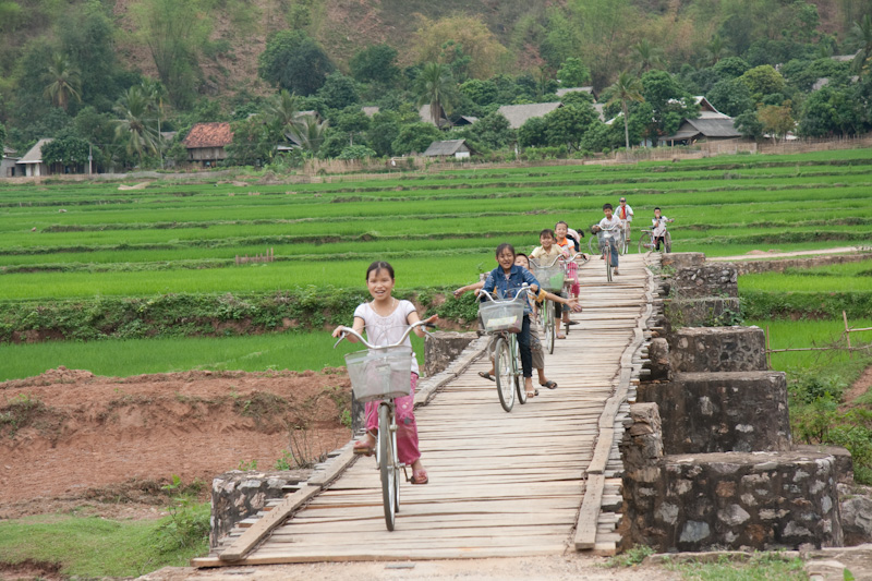 Apres passage d’un haut col au milieu des nuages, nous sommes donc arrive a Mai Chau, un petit village au fond d’une vallee perdue. La, nous avons pu dormir chez l’habitant, a savoir la minorite des Thais blancs, dans une maison typique en bois et bambous sur pilotis. La vallee est couverte de rizieres et parsemee de villages avec ces maisons typiques superbes. Nous avons passe 1 journee et demi a la sillonner en velos. Les habitants y sont particulierement accueillants et gentils.