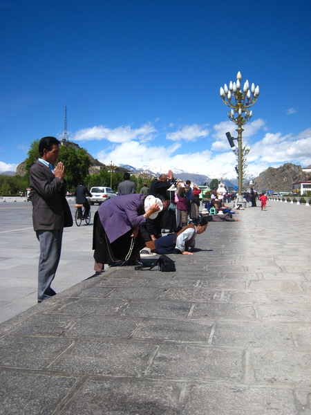 Les scènes de rues au Tibet sont dominées par la présence importante de pèlerins, à tel point qu’on peut avoir l’impression que les tibétains sont avant tout pèlerins de métier. Mais à y regarder de plus près, la foule entourant les monastères est essentiellement constituée de personnes jeunes ou agées. Les tibétains d’age moyen ne sont que faiblement représentés. Cela s’explique avant tout par le fait que les Chinois interdisent aux tibétains travaillant dans des organismes proches du gouvernement toute activité religieuse. Tout comme il leur est interdit de porter les habits traditionnels tibétains. Par peur de représailles ou surtout par peur de perdre leur emploi, ceux qui sont en age de travailler renoncent donc à pratiquer leur religion.