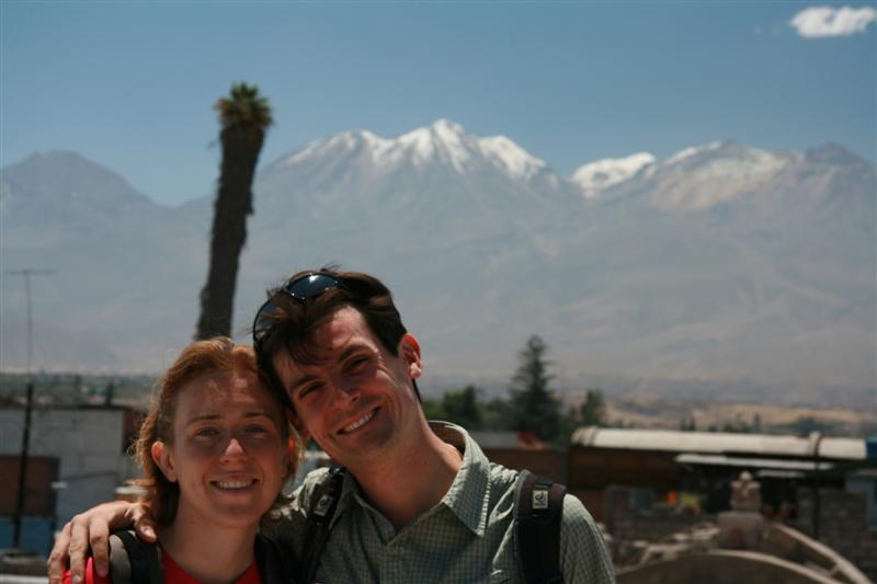 Apres un passage express a Lima, nous avons passe 2 jours sous le soleil d’Arequipa a visiter le monastere sainte Catherine (la photo dans les toilettes a Berlin pour les connaisseurs) et beaucoup d’autres eglises et monasteres… introduction au passe colonial du Perou. Le tout sous la surveillance des volcans Chacani (derriere nous sur la photo) et Misti… mais pas d’inquietude on s’est contente de les regarder d’en bas (deja a 2400m).